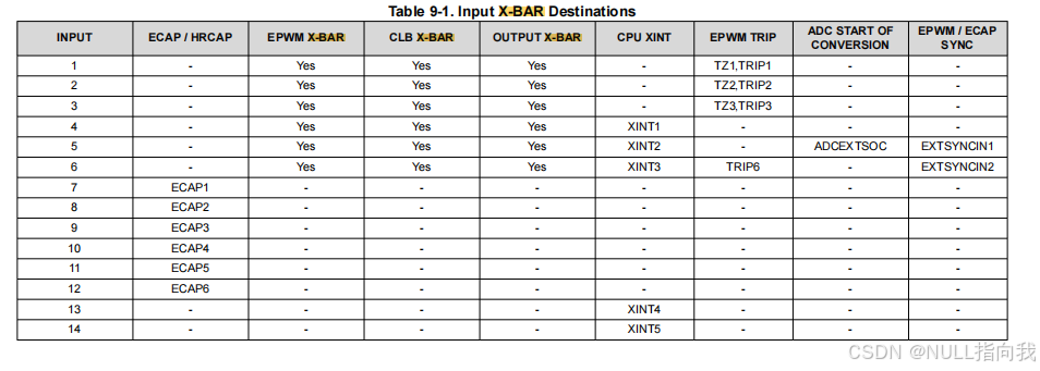 The Input X-BAR is configured by way of the INPUTxSELECT registers.翻译: X-BAR 通过