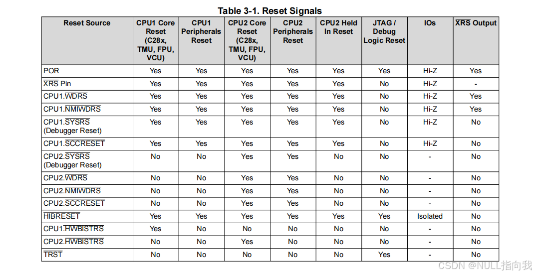 XRS外部引脚、POR上电、CPU1.WDRSCPU1 看门狗、CPU1.NMIWDRSNMI 看门狗)全芯片彻底复位,CPU1、CPU2、所有外设、寄存器全部清零,相当于芯片完全重启。