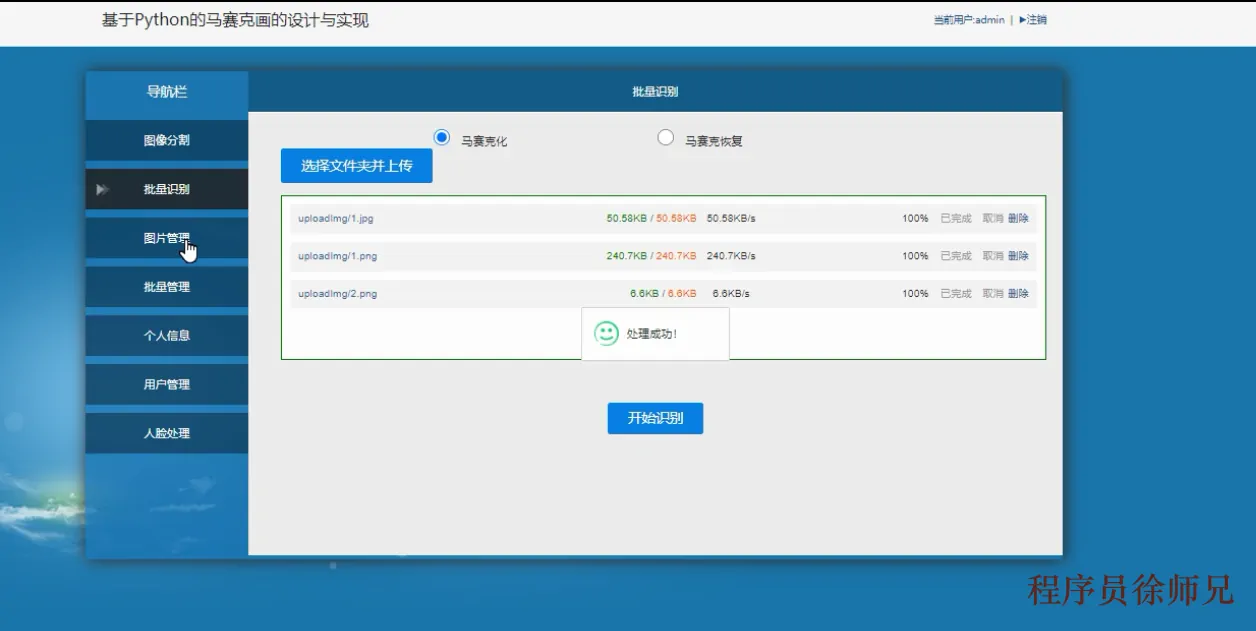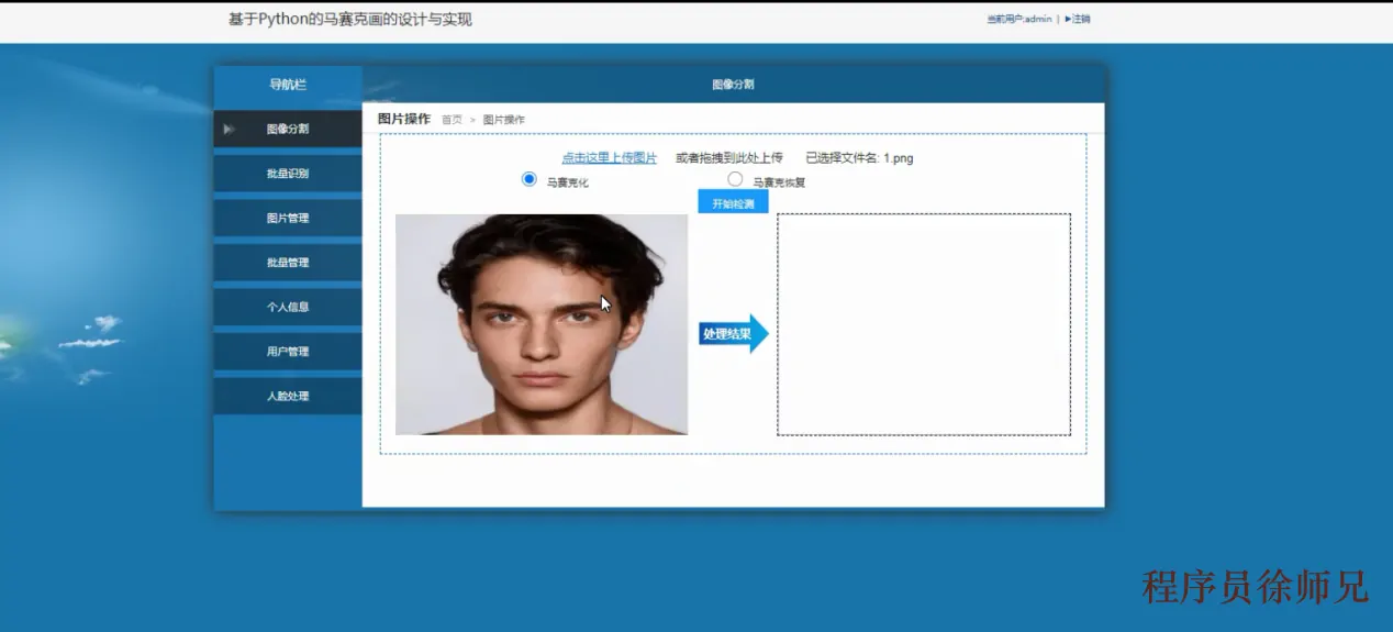 Python基于OpenCV的马赛克画,使用了Python编程语言,并基于Django框架构建了一个Web应用,在MySQL8数据库中存储和管理数据。为了实现从原始图像到马赛克图像的转换,我们采用了开放源代码的计算机视觉库OpenCV来进行图像处理和分析。