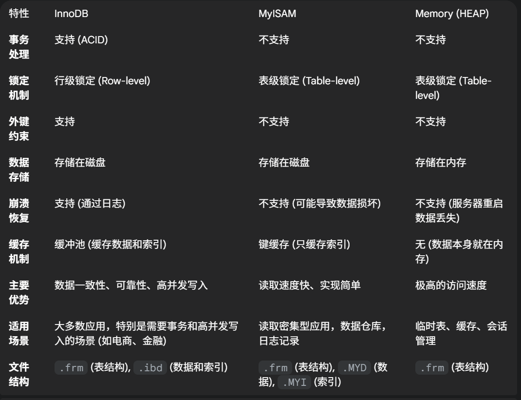 MyISAM 不支持事务 只有表级锁 没有外键 没有MVCC