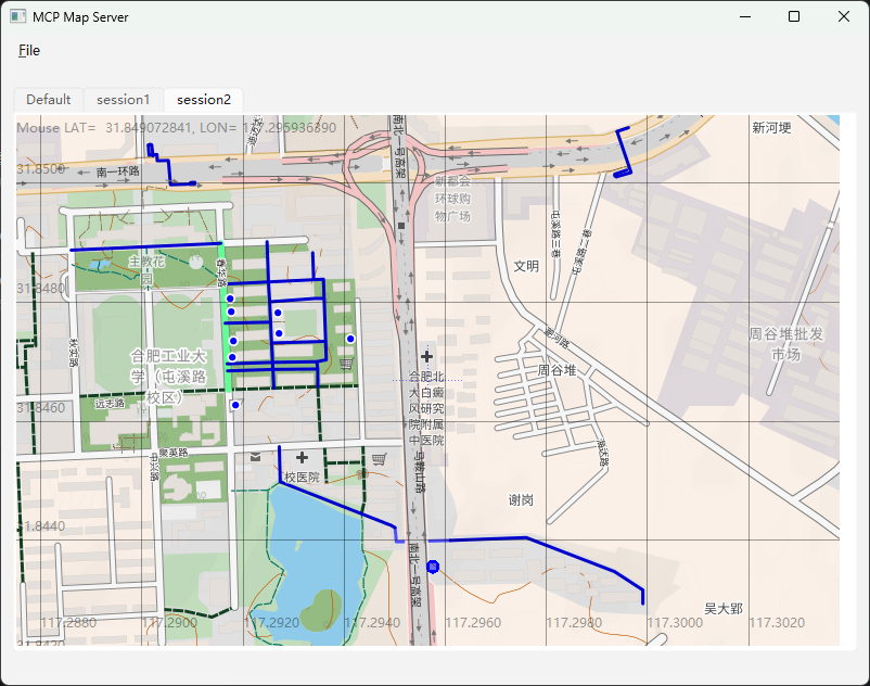现在地图已经在会话2中显示在合肥工业大学的位置,缩放级别为10,标记清晰可见。