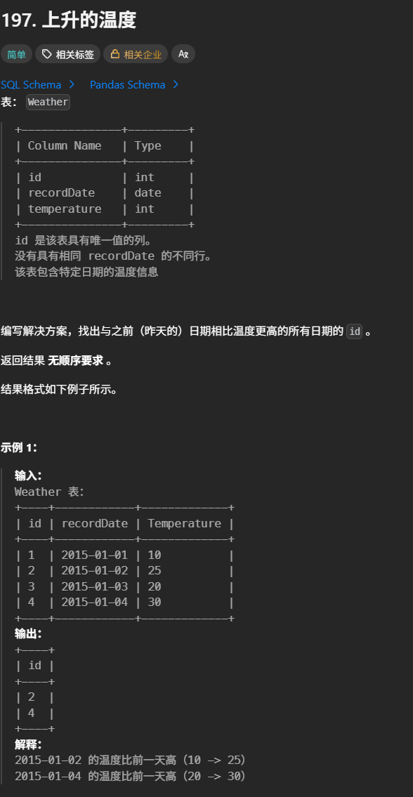 AND w1.temperature > w2.temperature 筛选出「今天温度 > 昨天温度」的记录,最终取出今天的 id 作为结果