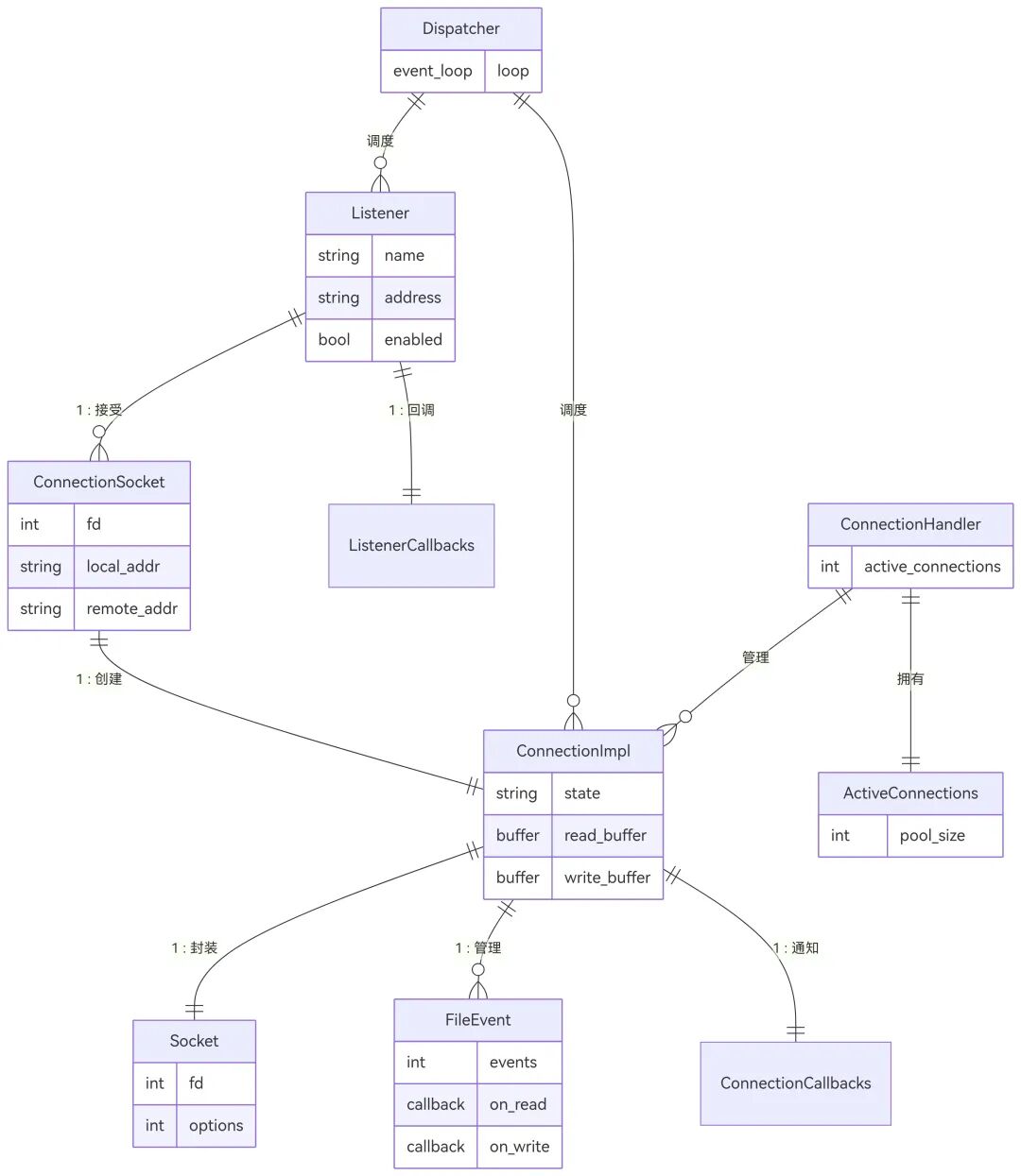 备注:实体之间的连线表示关系,例如 Listener ||--o{ ConnectionSocket 表示一个 Listener 可以接受零个或多个 ConnectionSocket。