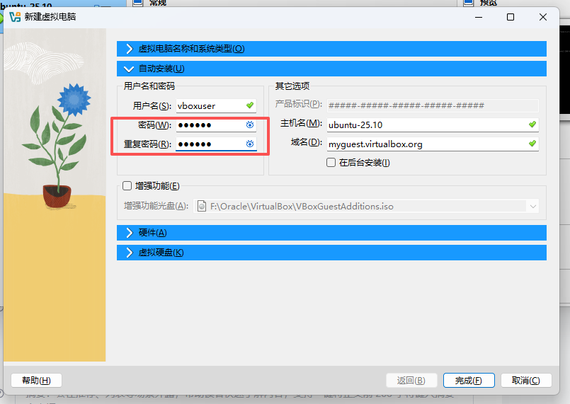 点击完成即可。直接等着完成安装,完成后使用vboxuser登录,密码就是上图你设置的。