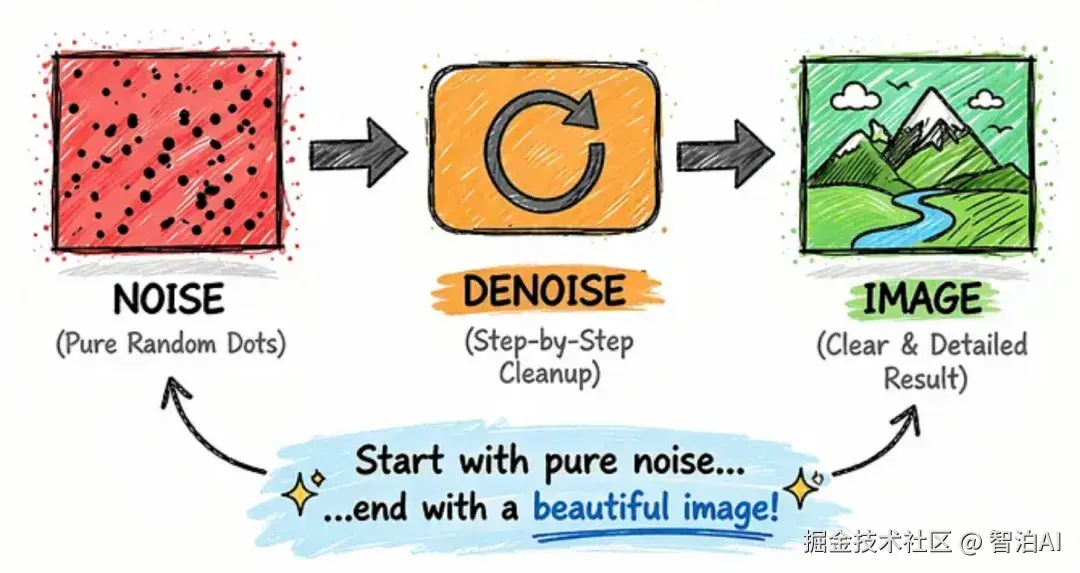 它的原理特别巧妙,甚至有点鬼才:先学会把一张清晰的照片,揉成一团乱七八糟的噪音,然后再学会把这团噪音,一点点还原成原来的照片。