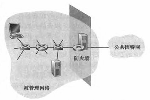 防火墙 (firewall) 是一个硬件和软件的结合体,它将一个机构的内部网络与整个因特网隔离开,允许一些数据分组通过而阻止另一些分组通过。 防火墙允许网络管理员控制外部和被管理网络内部资源之间的访问,这种控制是通过管理流入和流出的流量实现的。 防火墙具有3 个目标: