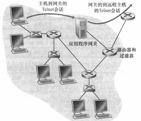 在上面的例子中,我们已经看到了分组级过滤使得一个机构可以根据IP 的内容和TCP/UDP 首部(包括IP地址、 端口号和ACK 比特)执行粗粒度过滤。 但是如果一个机构仅想为一个内部用户提供Telnet应用程序的过滤该怎样做呢?如果该机构要这些特权用户在允许创建向外部的Telnet会话之前首先鉴别他们自己该怎样做呢?这些任务都超出了传统过滤器和状态过滤器的能力。 的确,有关内部用户的身份信息是应用层数据, 并不包括在IP/TCP/UDP首部中。