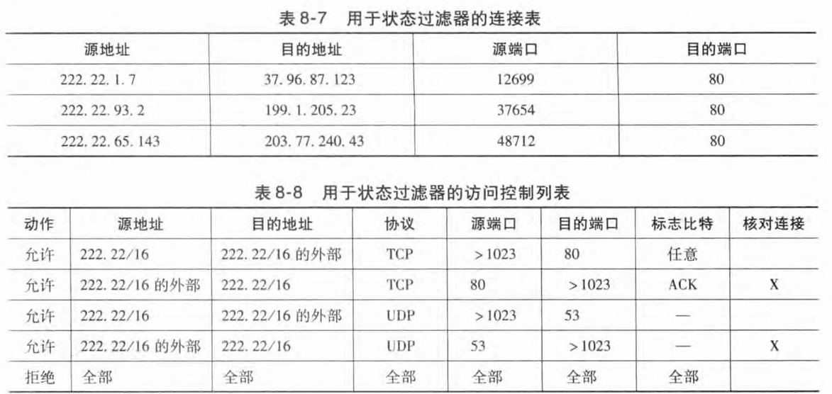 状态过滤器通过用一张连接表来跟踪所有进行中的TCP连接来解决这个问题。 这种方法是可能的:因为防火墙能够通过观察三次握手 (SYN、 SYNACK 和 ACK) 来观察一条新连接的开始;而且当它看到该连接的一个FIN分组时,它能够观察该连接的结束。当防火墙经过(比如说)60秒还没有看到该连接的任何活动性,它也能够(保守地)假设该连接结束了。 某防火墙的一张连接表例子显示在下方第一张表中(用于状态过滤器的连接表)。 这张连接表指示了当前有3 条进行中的TCP连接,所有的连接都是从该机构内部发起的。此外,该状态过滤器在它的访问控制列表中包括了一个新栏,即"核对连接",如表中所示 , 注意到该表与传统的分组过滤器的访问控制列表相同,只是此时它指示应当核对其中两条规则所对应的连接。