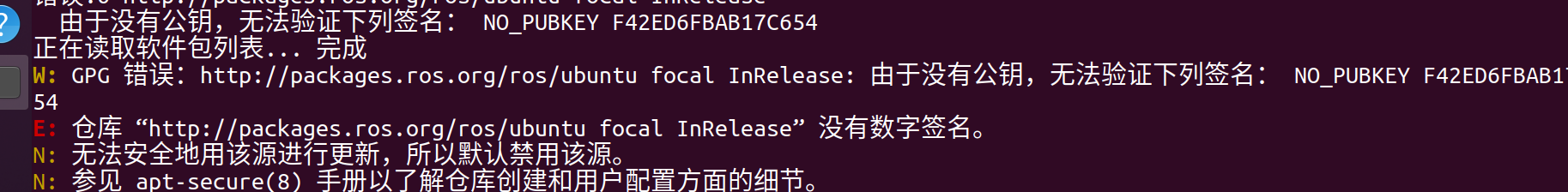 执行指令":sudo apt-key adv --keyserver hkp://keyserver.ubuntu.com:80 --recv-keys F42ED6FBAB17C654出现已导入:1,证明成功,如下图所示