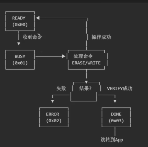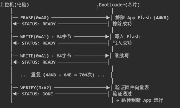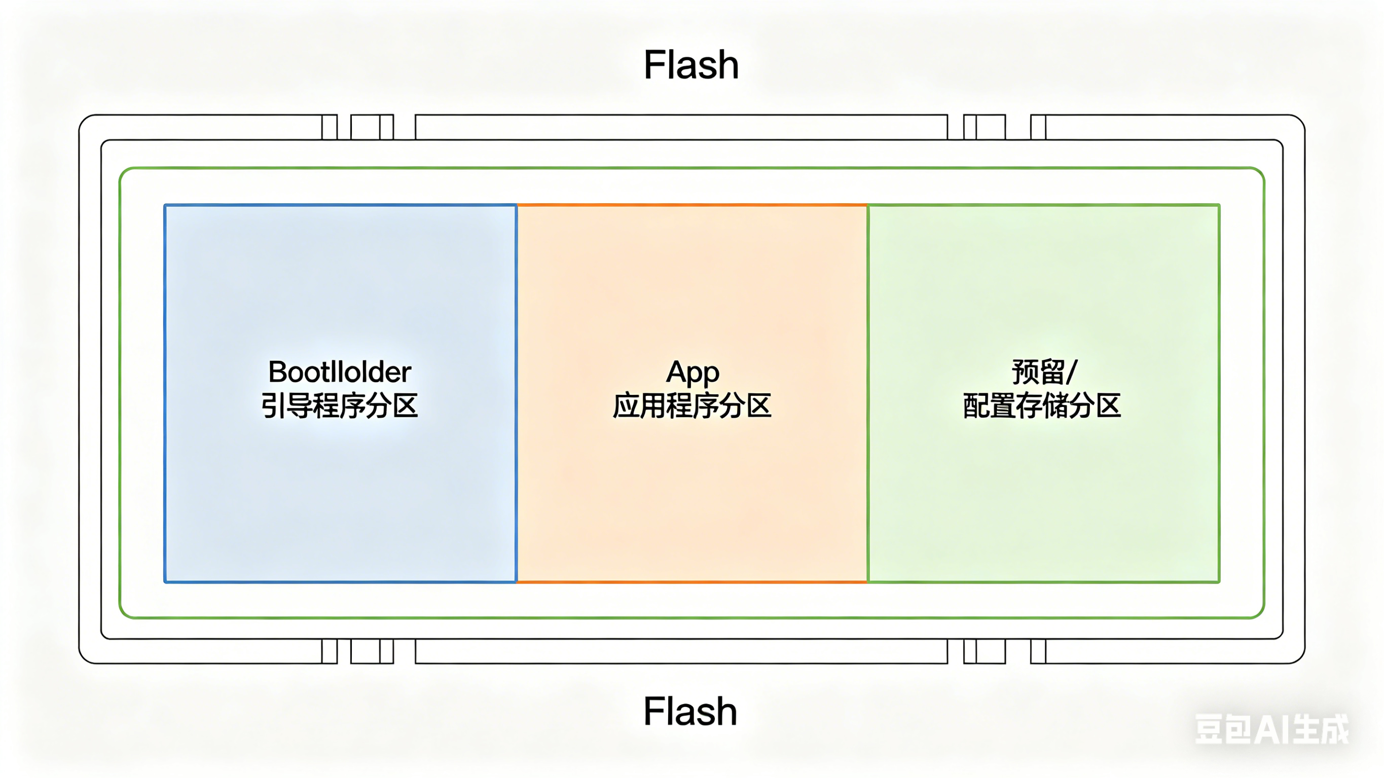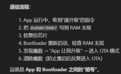 Bootloader :Bootloader(引导加载程序) 是设备上电或复位后,CPU 执行的第一段软件代码 ,是连接硬件与操作系统(或主应用程序)的桥梁。它的核心任务是初始化硬件、加载并启动系统内核 ,为 OTA 升级提供底层支持。