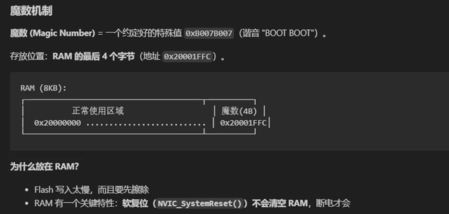 魔数:自己设置的一个标志位数据,一般是设置为RAM最后四个字节,软复位时不会被清除