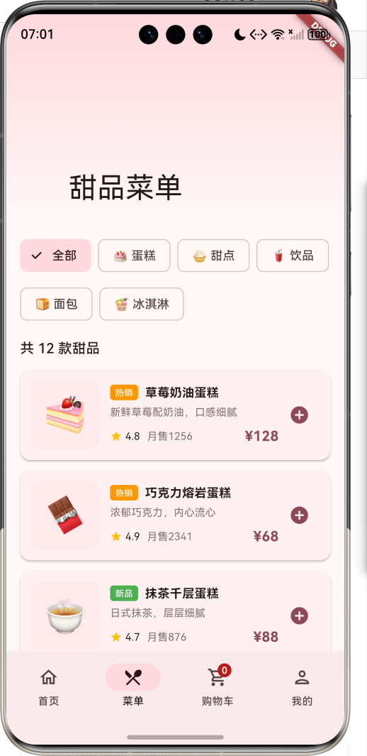 应用以温馨的粉色为主色调,象征甜蜜与幸福。涵盖首页推荐、甜品菜单、购物车、个人中心四大模块。用户可以浏览热销新品、筛选商品类型、管理购物车、提交订单、查看订单状态,实现一站式甜品预订服务。
