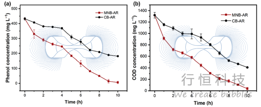中国矿业大学研究团队在《Bioresource Technology》发表重要成果, 采用上海行恒科技有限公司LF1500微纳米气泡发生器构建的曝气生物反应器(MNB-AR) ,成功驯化出高效 苯酚降解菌群,在处理高浓度苯酚(1000 mg L⁻¹)的焦化废水时,苯酚和 COD去除率分别比传统曝气反应器(CB-AR) 提高55%和39%,为解决高毒性工业废水处理难题提供了创新生物强化策略。