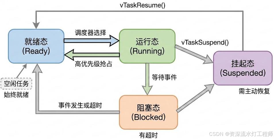 - 空闲任务:调度器启动时自动创建,优先级最低,仅当系统中无其他就绪任务时执行。核心职责:回收已删除任务的内存、执行空闲钩子函数、进入低功耗模式。