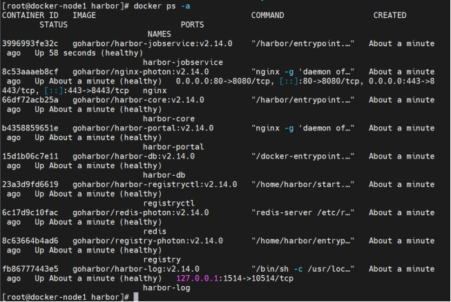 查看运行容器root@docker-node1 \~\]# docker ps CONTAINER ID IMAGE COMMAND CREATED STATUS PORTS NAMES 0471dadd1d29 nginx:1.26 "/docker-entrypoint...." About a minute ago Up About a minute 80/tcp web 查看所有容器 \[root@docker-node1 \~\]# docker ps -a 交互模式运行容器 \[root@docker-node1 \~\]# docker run -it --name busybox busybox:latest 交互运行容器默认退出后会停止 \[root@docker-node1 \~\]# docker ps -a CONTAINER ID IMAGE COMMAND CREATED STATUS PORTS NAMES 0471dadd1d29 nginx:1.26 "/docker-entrypoint...." 4 minutes ago Up 4 minutes 80/tcp web 3472b02fe085 busybox:latest "sh" 2 days ago Exited (137) 2 days ago test 运行停止的容器 \[root@docker-node1 \~\]# docker start busybox root@docker-node1 \~\]# docker ps -a CONTAINER ID IMAGE COMMAND CREATED STATUS PORTS NAMES d1b27167a247 busybox:latest "sh" 2 minutes ago Up 1 second busybox 运行停止的容器 \[root@docker-node1 \~\]# docker start busybox root@docker-node1 \~\]# docker ps -a CONTAINER ID IMAGE COMMAND CREATED STATUS PORTS NAMES d1b27167a247 busybox:latest "sh" 2 minutes ago Up 1 second busybox 退出交互容器不对其停止 \[root@docker-node1 \~\]# docker attach busybox / # \[ctrl\]+\[p\]+\[q\] #按键 \[root@docker-node1 \~\]# docker ps -a CONTAINER ID IMAGE COMMAND CREATED STATUS PORTS NAMES d1b27167a247 busybox:latest "sh" 3 minutes ago Up About a minute busybox 查看容器信息 \[root@docker-node1 \~\]# docker inspect busybox 容器控制 \[root@Docker-node1 \~\]# docker stop busybox #停止容器 \[root@Docker-node1 \~\]# docker kill busybox #杀死容器,可以使用信号 \[root@Docker-node1 \~\]# docker start busybox #开启停止的容器 在已经运行的容器中执行指定命令 \[root@docker-node1 \~\]# docker exec busybox touch /root/haha #非交互 \[root@docker-node1 \~\]# docker exec busybox ls /root file1 file2 haha \[root@docker-node1 \~\]# docker exec -it web /bin/bash #交互的 root@f3e369725fab:/# 容器删除 \[root@docker-node1 \~\]# docker rm -f busybox busybox \[root@docker-node1 \~\]# docker stop web web \[root@docker-node1 \~\]# docker rm web web 内容提交 注: 默认情况下,容器被删除后,在容器中的所有操作都会被清理,包括要保存的文件 如果想永久保存,那么我们需要把动作提交,提交后会生成新的镜像 当我们在运行新镜像后即可看到我们提交的内容 \[root@docker-node1 \~\]# docker run -it --name test busybox:latest / # touch /root/file / # ls /root/ file ctrl+qp 退出当前环境并继续运行容器 \[root@docker-node1 \~\]# docker commit -m "add file" test busybox-file:latest sha256:31a32089d241d025a5a54f144f15319cc6fb55be1b41d049f8905a472d5a028e \[root@docker-node1 \~\]# docker images i Info → U In Use IMAGE ID DISK USAGE CONTENT SIZE EXTRA busybox-file:latest 31a32089d241 6.71MB 2.21MB \[root@docker-node1 \~\]# docker run -it --name test busybox-file:latest 文件在镜像中的复制 \[root@docker-node1 \~\]# docker run -it --name test busybox-file:latest root@docker-node1 \~\]# docker cp test:/root/file /mnt Successfully copied 1.54kB to /mnt \[root@docker-node1 \~\]# ls /mnt/ file hgfs \[root@docker-node1 \~\]# docker cp /etc/passwd test:/root/ Successfully copied 3.07kB to test:/root/ \[root@docker-node1 \~\]# docker exec test ls /root file passwd