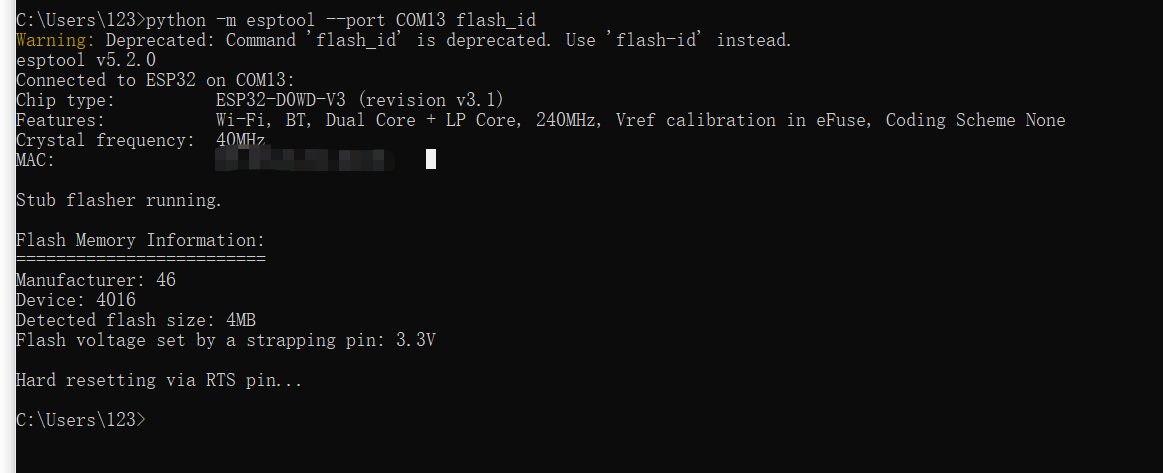 Connecting....然后识别芯片、MAC、烧录进度。 -