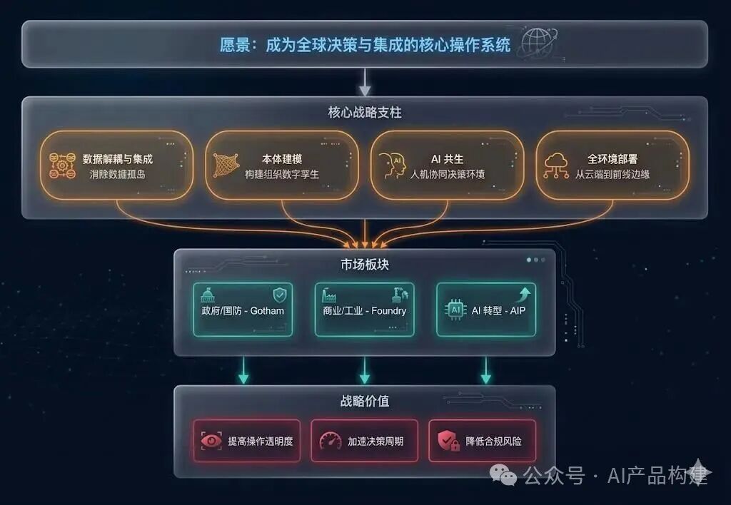 依托本体建模、AI 共生等四大技术支柱,Gotham、Foundry、AIP 三大平台直接切入核心业务。