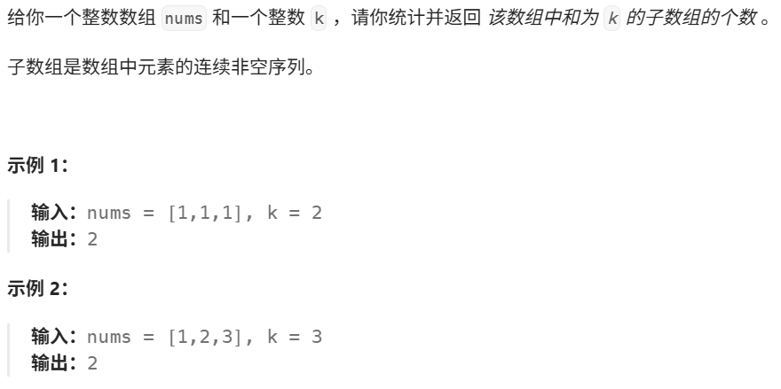 前缀和很巧妙的可以只用遍历数组一次就可以得到,两个元素对应的前缀和相减就可以得到他们俩之间的元素的和。同时再创建一个unordered_map,其key为每个元素的前缀和,value为该前缀和出现的次数。需要注意的是map[0] = 1;因为可能出现仅一个元素就可满足。思路是:for循环计算每个元素所对应前缀和,然后找是否有两前缀和相减为k(也就是某一段数组的和为k),若有则算是找到了符合要求的子数组,加对应的次数。