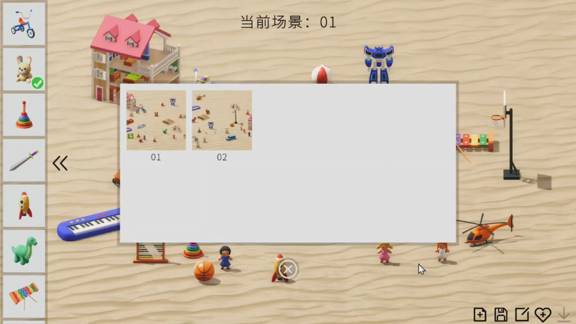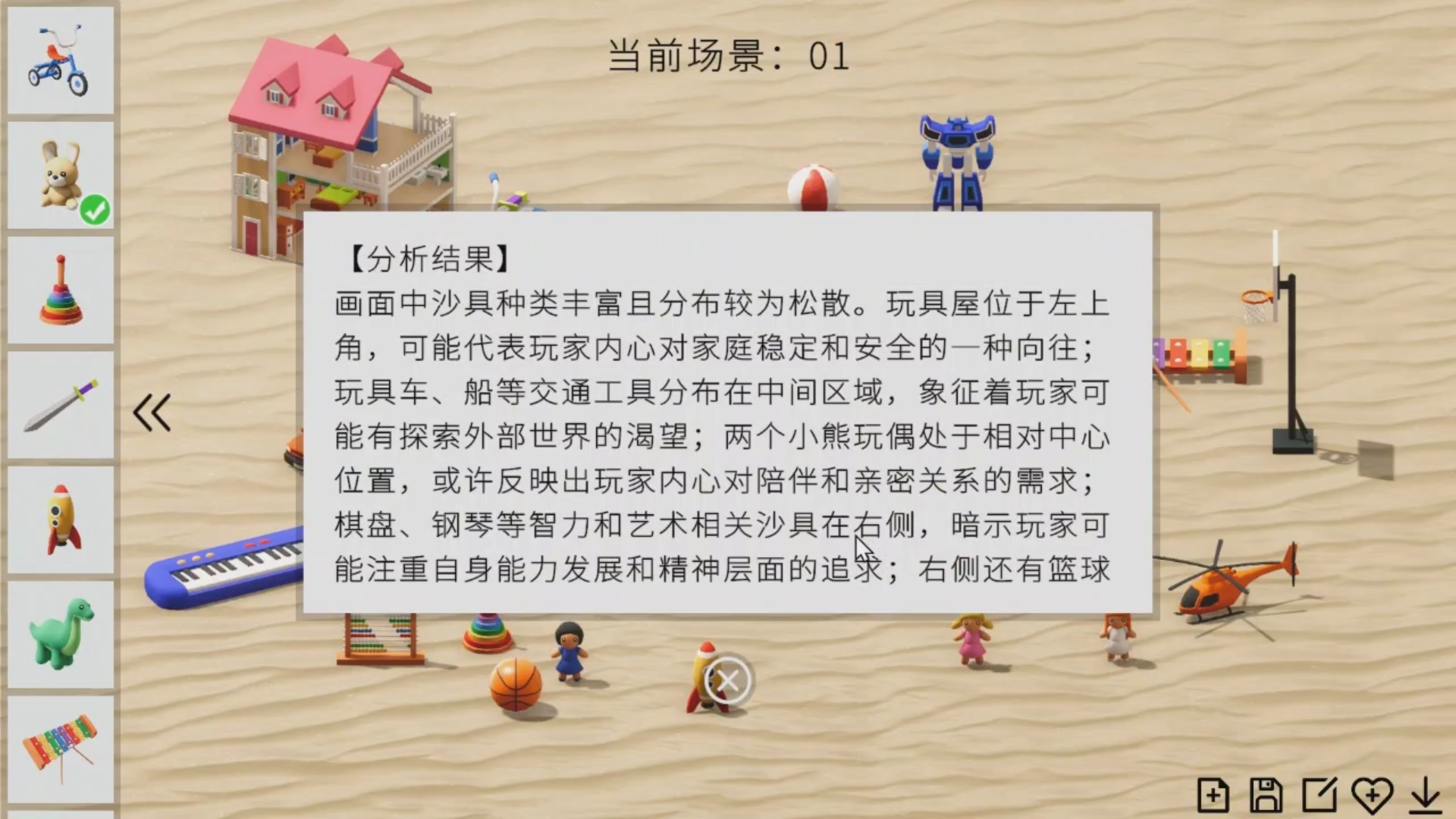 基于 Unity3D 引擎开发的心理沙盘互动项目,内置 20 余种沙具模型(交通工具、玩偶、乐器、房屋及体育器材等),支持缩略图生成、选中高亮及移动、旋转、删除操作。提供场景保存与加载功能,并集成 AI 自动生成心理报告,支持 PDF 预览与下载。