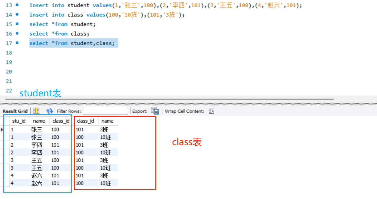 MySQL内部进行笛卡尔运算后得到的结果是混乱的,需要加上条件得到期望结果