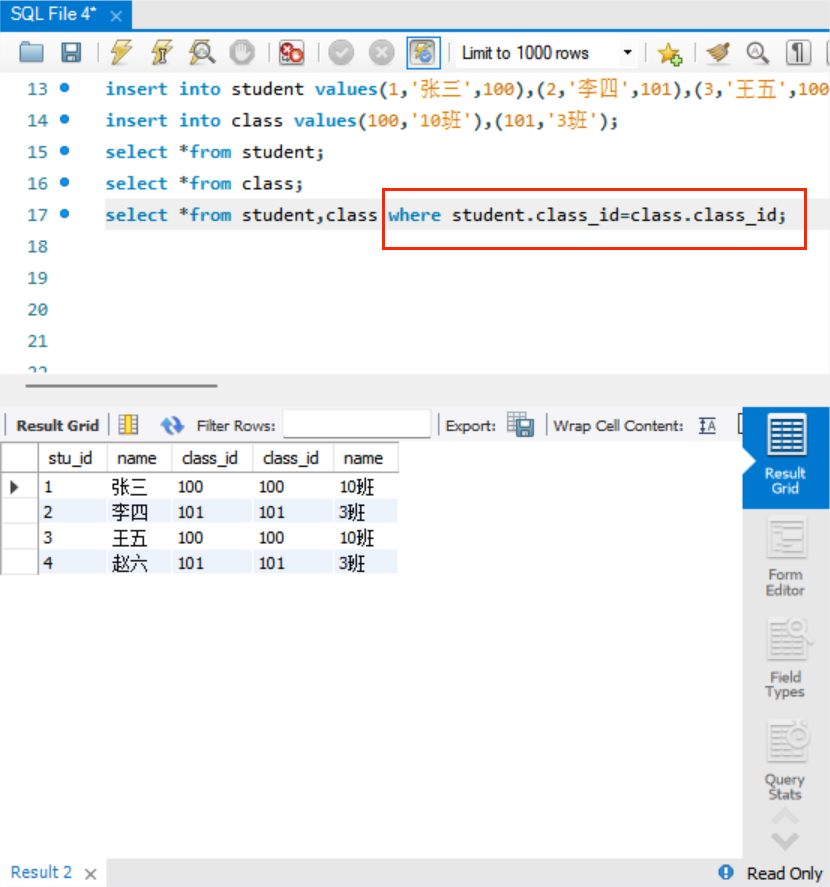2.查询学生的班级及班级名称