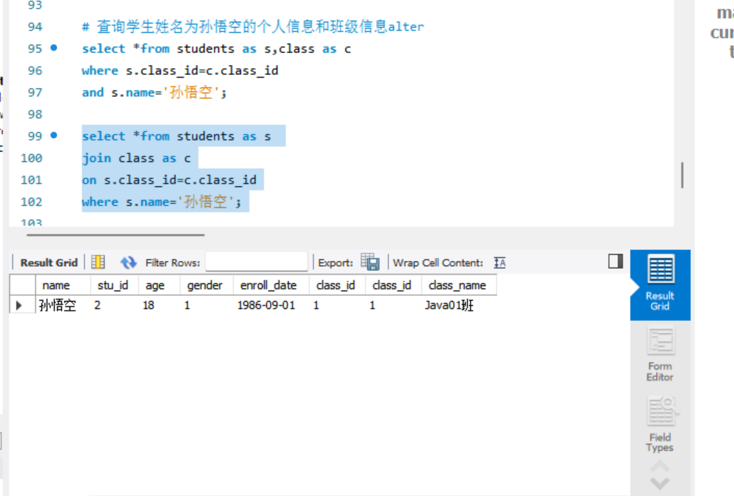 3.查询学生姓名为孙悟空的个人信息和班级信息alter