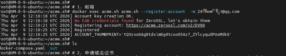 root@VM-0-9-ubuntu:~/acme.sh# # 1. 邮箱注册(用于接收证书过期提醒及账号验证)
