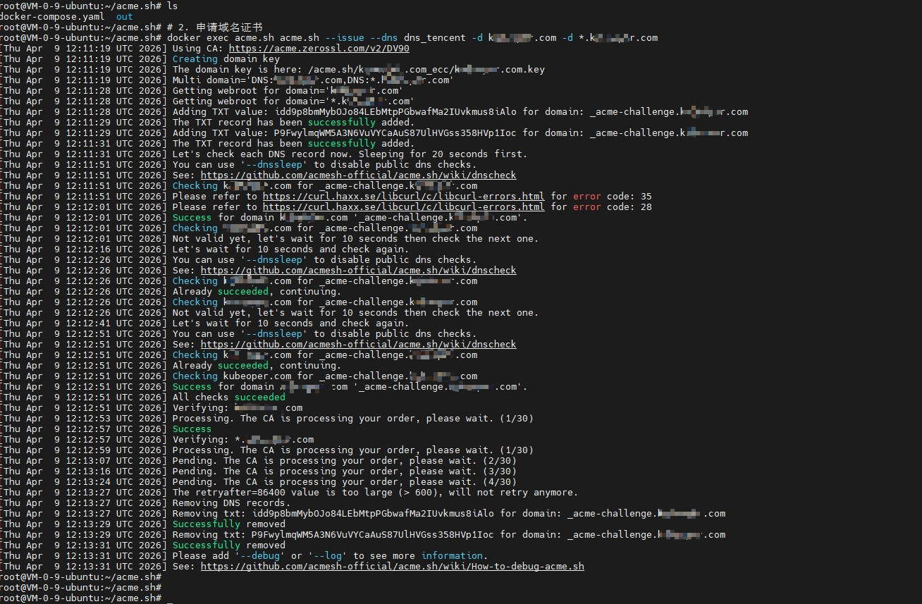 root@VM-0-9-ubuntu:~/acme.sh# docker exec acme.sh acme.sh --issue --dns dns_tencent -d example.com -d *.example.com