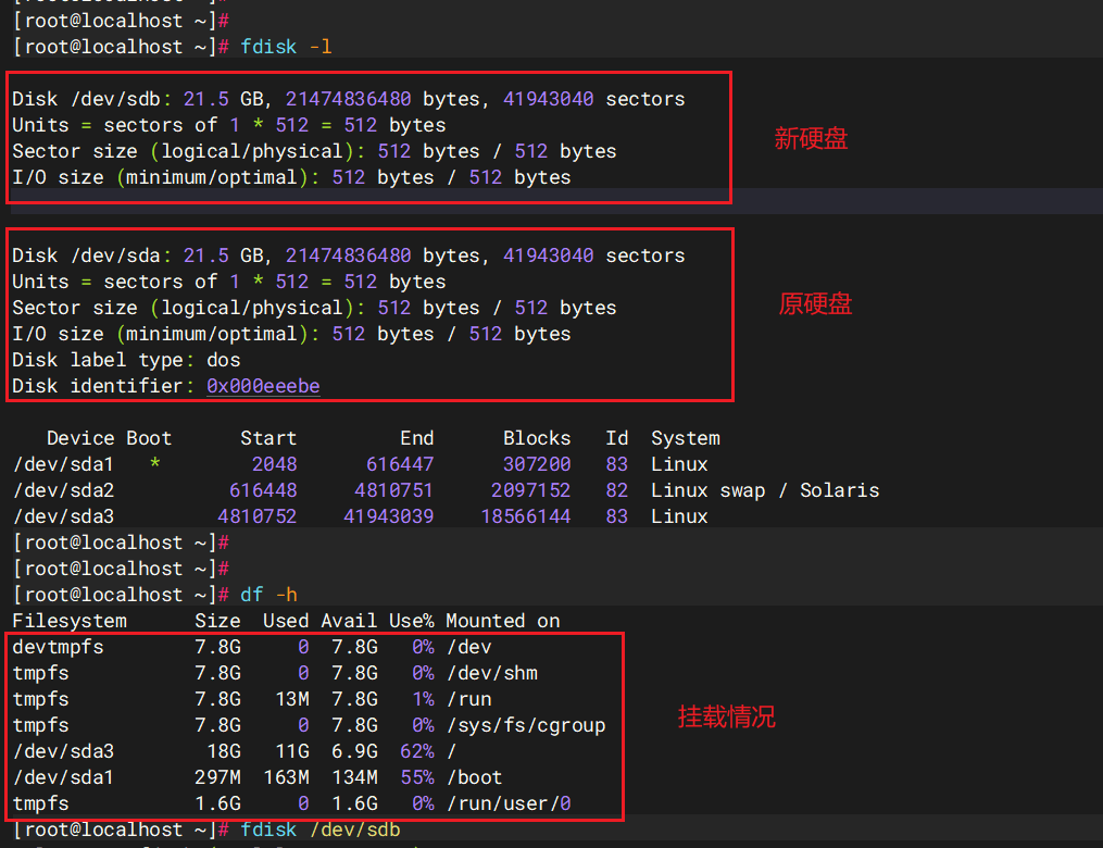 得知我的新硬盘名称,/dev/sdb,硬盘命名是 sda、sdb、sdc......以此类推的