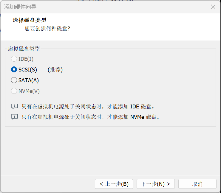 推荐选 创建新虚拟机磁盘,待会儿在系统里面手动格式化、挂载