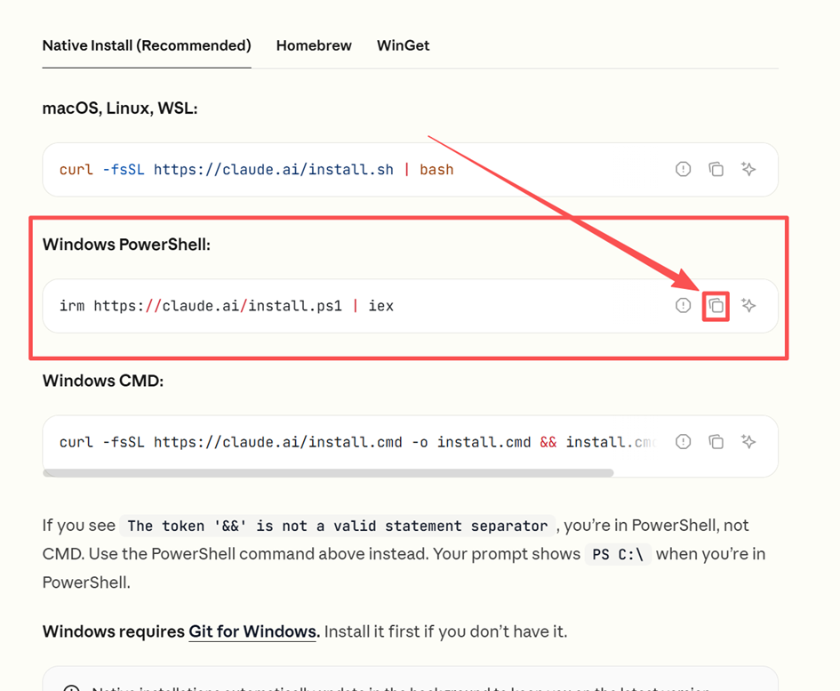 - 先进入 Claude Code 官方文档页面,获取 Windows 安装命令并完成本体安装;