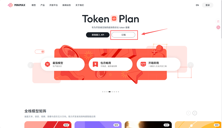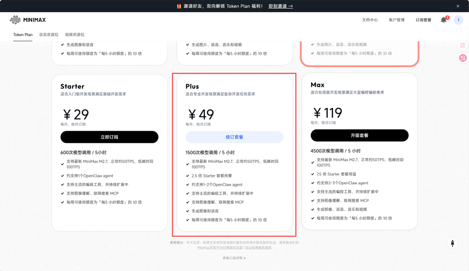 其中,API Key 需要先去 MiniMax 官网申请。打开 MiniMax 官网(https://www.minimaxi.com/)后,可以看到首页与套餐页面,如图所示。这里的实际操作逻辑是:先注册或登录账号,再根据自己的使用需求选择合适的套餐。