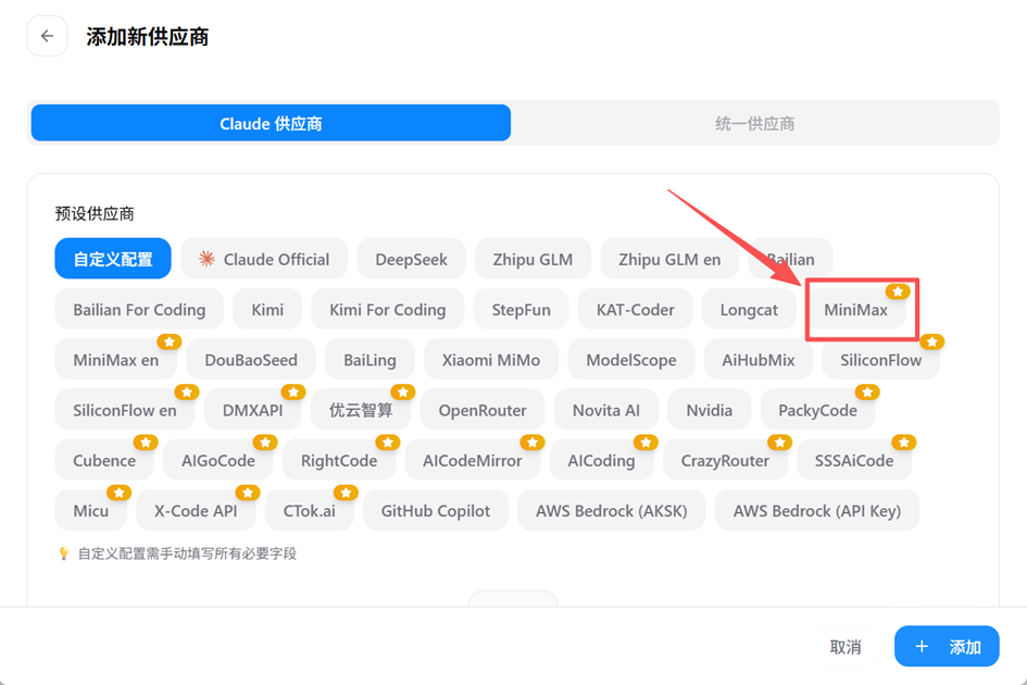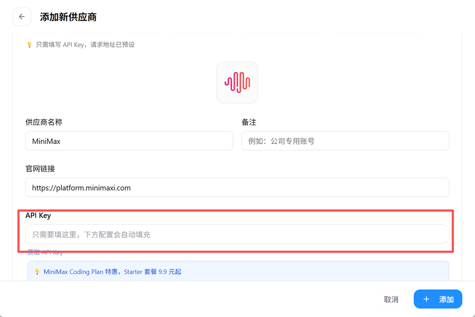 当我们点击新增配置后,需要填写供应商信息,而这时最关键的就是 MiniMax API Key。