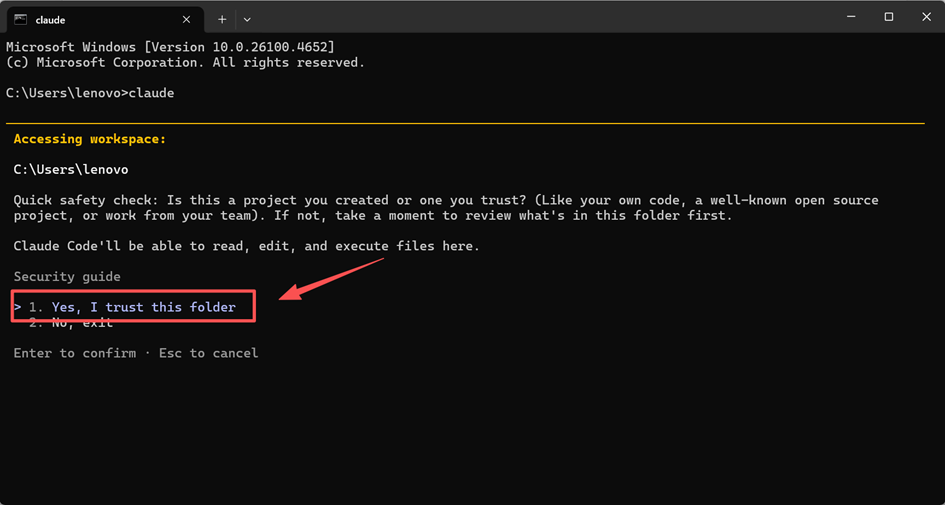 首次启动时,Claude Code 会先进行工作目录安全确认,如图所示。界面会询问当前目录是否可信。这里如果是你自己的项目目录,直接选择 "Yes, I trust this folder" 即可。