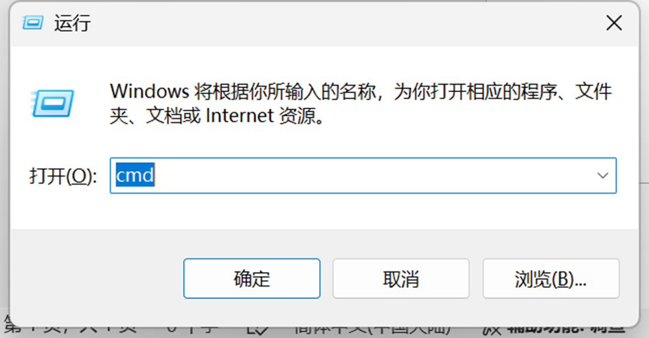 接下来按下 Win + R,打开系统运行窗口,在输入框中输入 cmd,如图所示,然后回车打开命令行窗口。
