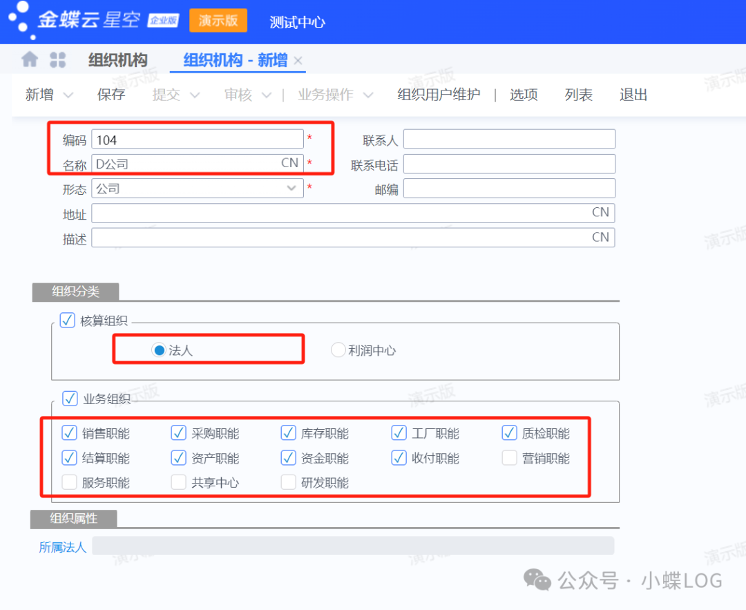 填写一下编码和名称;然后选择'法人',勾选组织需要拥有的职能,比如是否能进行销售,采购等等。不清楚就可以全部勾上。