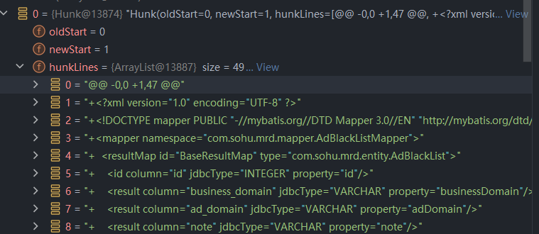 解析 Hunk 后,可以先得到每个变更块对应的新旧文件起始行号及区间信息。