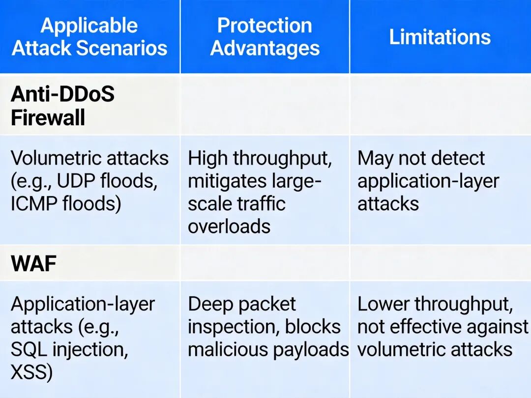 | 抗 DDoS 防火墙 | 基于流量特征过滤、半连接防护、流量限速机制 | 网络层、传输层 DDoS 攻击 | 部署简单、防护效率高 | 无法防护应用层 CC 攻击、大流量攻击时容易出现单点瓶颈 |