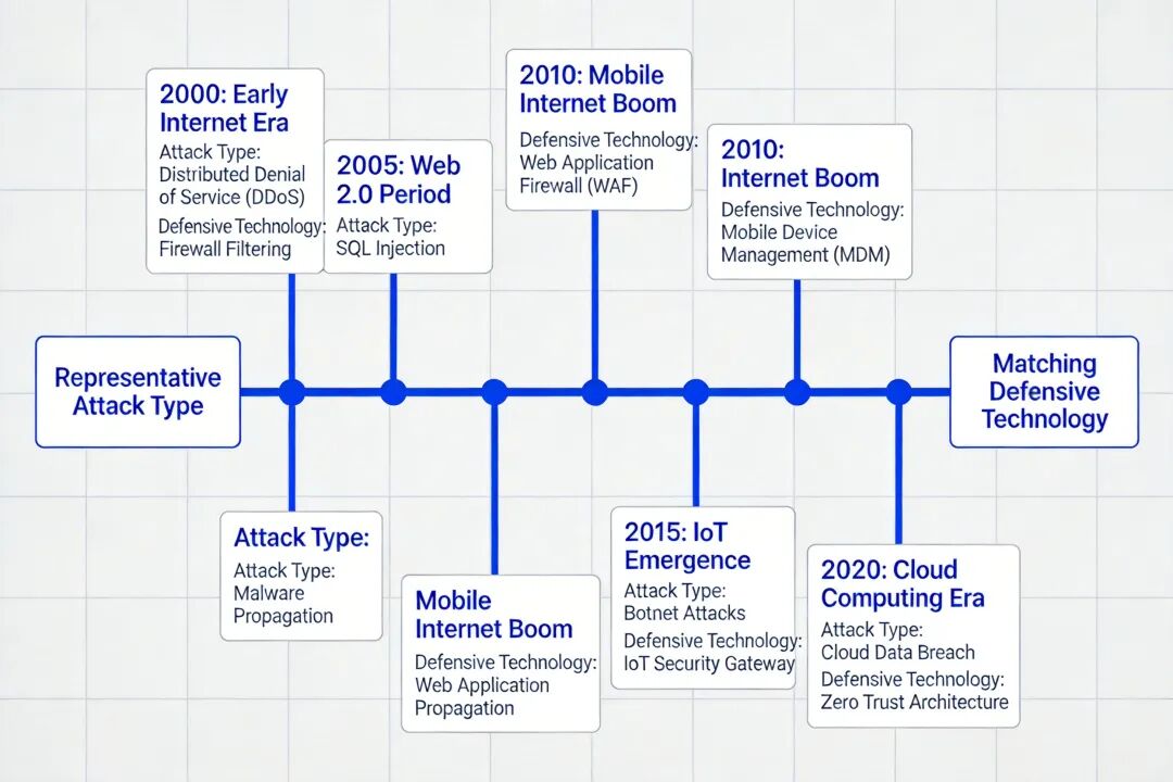 网络攻击与防御技术演进路线图,标注关键时间节点的典型攻击和防御技术