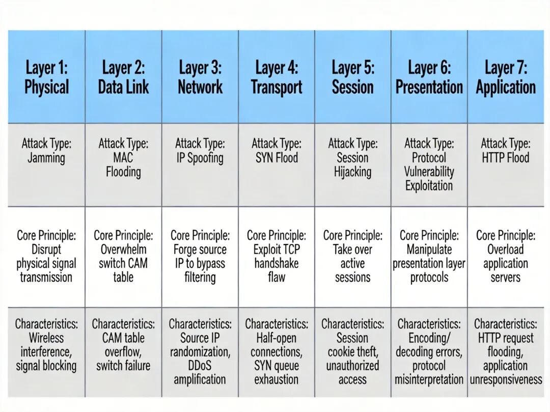 DoS/DDoS 攻击类型分层示意图,标注各攻击对应的 OSI 层级、核心原理与典型特征