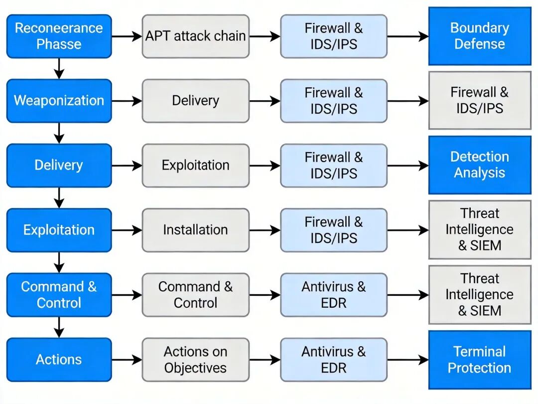 APT 攻击链与防御体系对应关系图,标注每个攻击阶段对应的防御措施