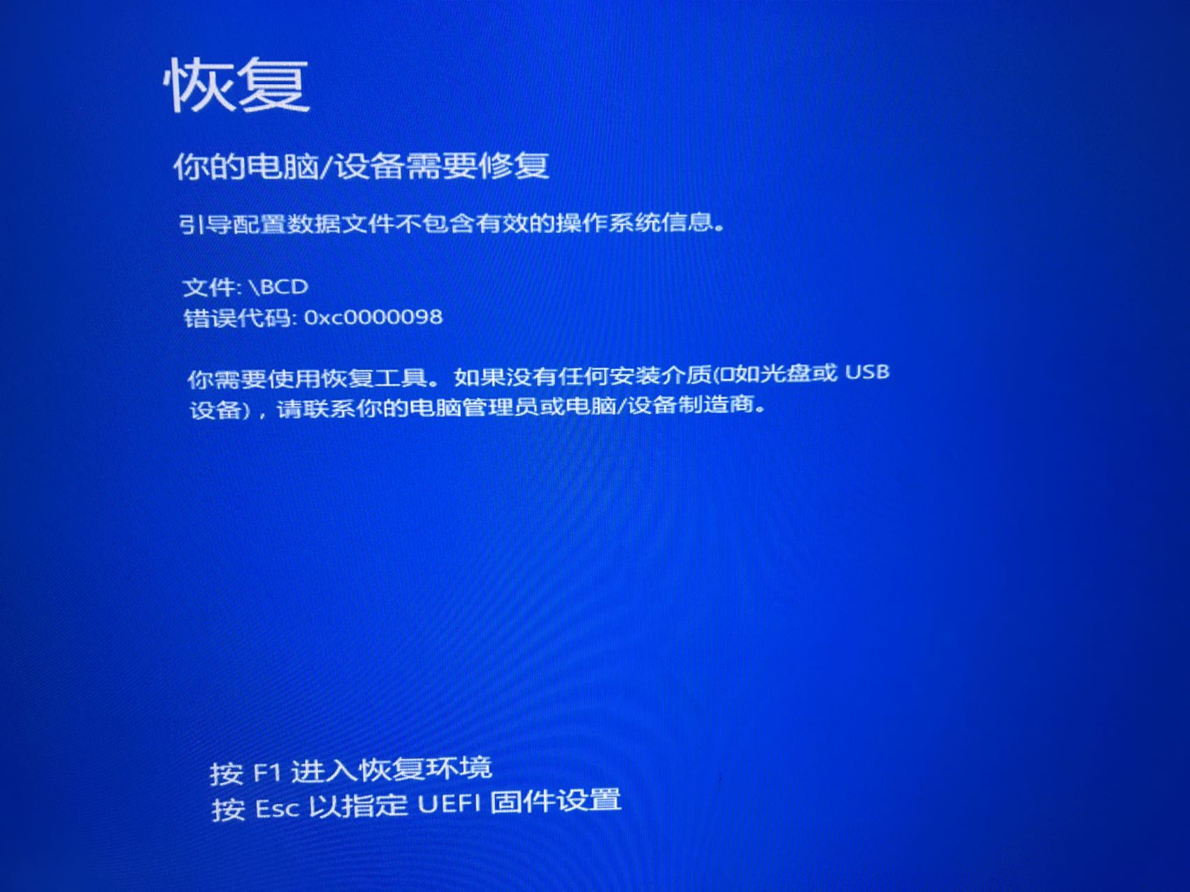 0xc0000098 -- "引导配置数据文件不包含有效的操作系统信息,文件:\BCD"