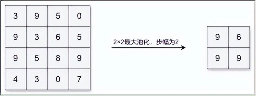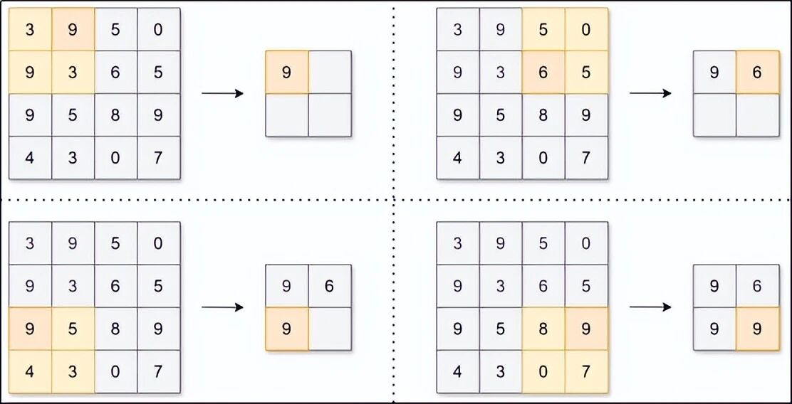 最常用的是最大池化。它把特征图分成一个个小方块(比如 2×2),每个方块只保留最大的那个数,其余三个扔掉。