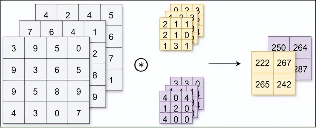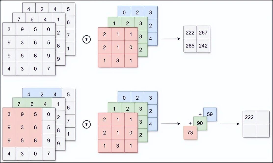 计算时:每个通道单独做卷积,然后把三个通道的结果加起来,得到一个数字。这样就兼顾了颜色信息。