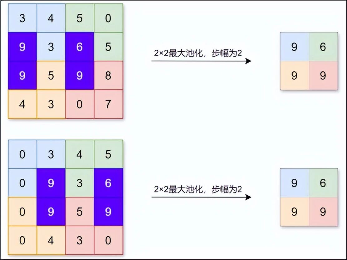 还有一种平均池化,它不取最大值,而是取方块里所有数的平均值。效果更平滑,但会削弱突出特征。分类任务通常用最大池化。