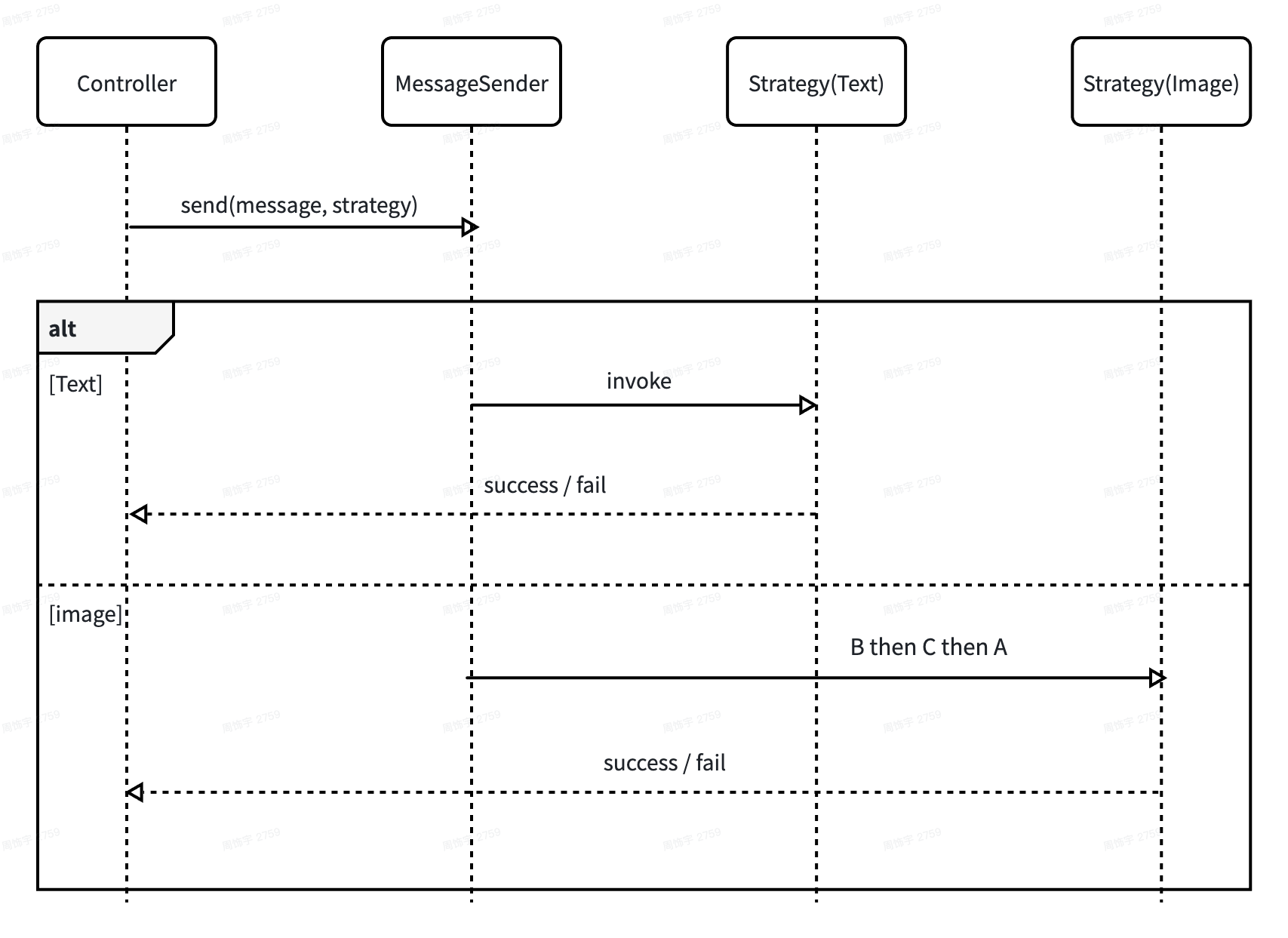 Controller 只保留一行调度:messageSender.send(msg, strategy: image),复杂链路下沉到策略内部。