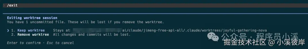 当我们从Worktree中退出时,Claude Code CLI会提示我们选择保留或删除,需要保留下次继续使用一定要选【Keep worktree】