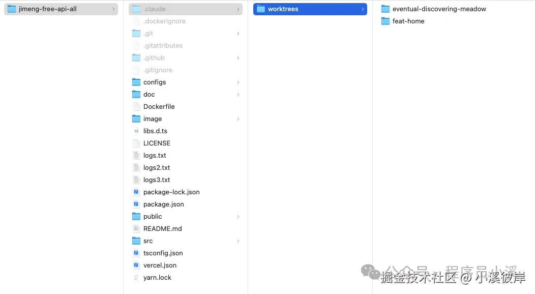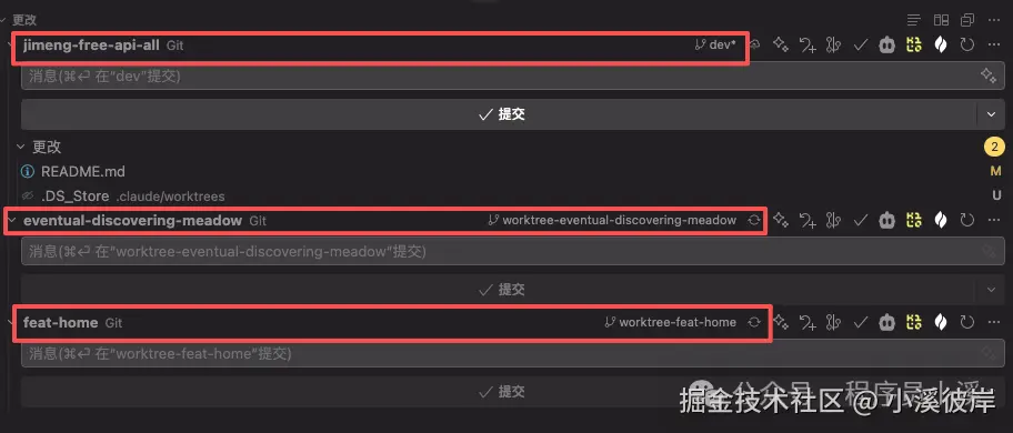 分别执行上面命令,启动后可以看到Claude Code在工作区 .claude/worktrees 目录下创建了2个新的工作区目录 eventual-discovering-meadow 和 feat-home