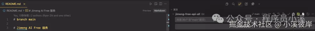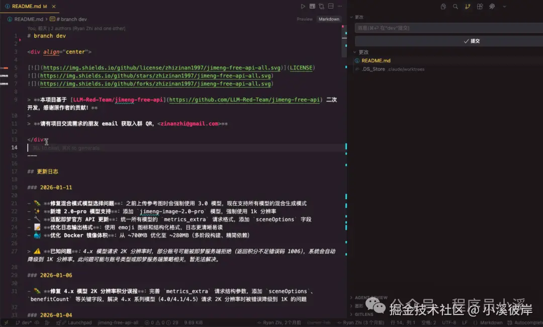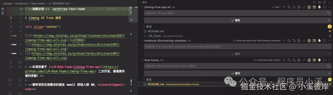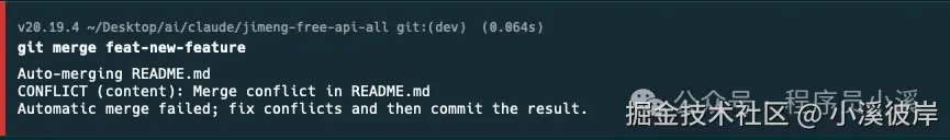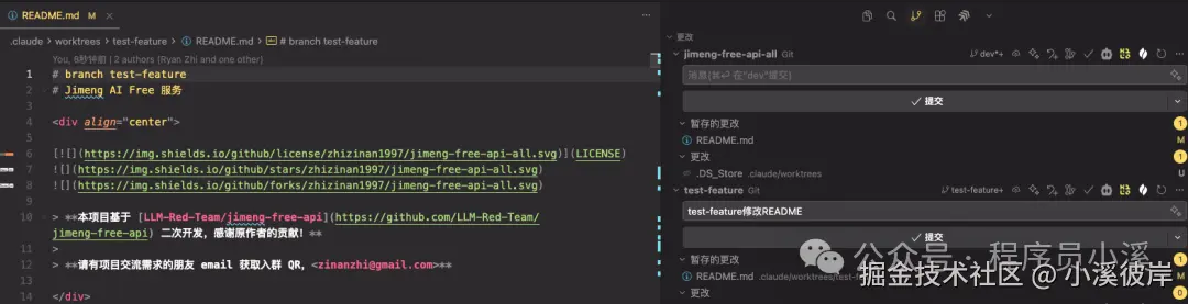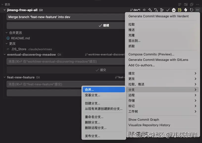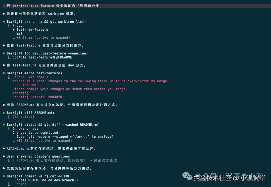 该示例中我们修改了 dev 和 worktree-test-feature 中的README文件,在合并时会出现冲突,我只需告诉AI合并规则就行,比如我这里是"保留双方更改",也可以在IDE中手动进行合并